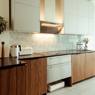 Пример оригинального дизайна: параллельная кухня-гостиная среднего размера в современном стиле с врезной мойкой, фасадами в стиле шейкер, черными фасадами, деревянной столешницей, белым фартуком, фартуком из керамической плитки, черной техникой, полом из керамогранита, серым полом и коричневой столешницей