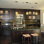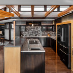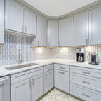 Пример оригинального дизайна: маленькая отдельная, параллельная кухня в современном стиле с двойной мойкой, плоскими фасадами, серыми фасадами, столешницей из кварцита, техникой из нержавеющей стали, паркетным полом среднего тона, коричневым полом и серой столешницей без острова — Houzz