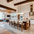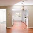 В некоторых проектах допускаются, отличающиеся друг от друга, покрытия для пола. Оно позволяет провести границы между обеденной зоной и местом для отдыха. А также допускается различная отделка потолка. В гостиной это может быть натяжной потолок с хрустальной люстрой, а на кухне подвесной с точечными галогенными светильниками.