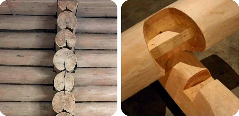 - Выпуски бревен остаются открытыми, виден укладочный паз.