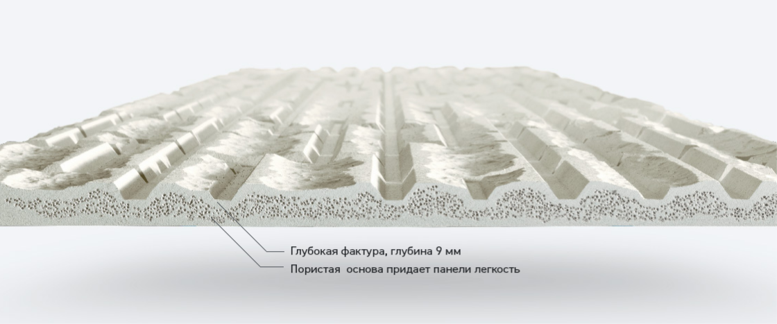 - Кроме цемента, песка и волокон, в сырьевой состав входят модифицирующие добавки, позволяющие сделать материал устойчивым не только к влаге, но и к ультрафиолету, пониженным температурам, механическим воздействиям. Панели формуют под высоким давлением, после чего, для нанесения фактуры, их пропускают через специальный вал.