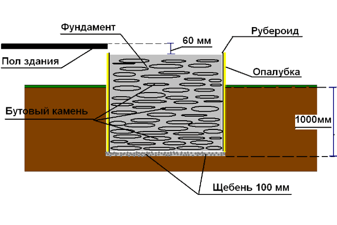 Верх фундамента должен возвышаться над уровнем напольного покрытия сантиметров на семь, для устройства изоляции по его поверхности укладывается два слоя рубероида.
