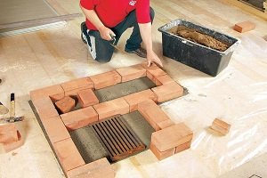 Фундамент под камин выводят до уровня ниже пола на 14-15 см. Поверхность тщательно и строго горизонтально выравнивают цементным раствором. После застывания на ней устраивают верхнюю часть фундамента, на которой непосредственно будет установлен камин. Верхнюю часть выкладывают двумя рядами кирпича на цементном растворе, между которыми прокладывают два слоя гидроизоляционного материала.