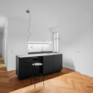 Источник вдохновения для домашнего уюта: параллельная кухня в современном стиле с плоскими фасадами, черными фасадами, черной техникой, темным паркетным полом, островом, коричневым полом и белой столешницей