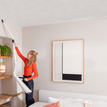 It feels rewarding to help build a bedroom which can make a little toddler feel happy to be in. Bright colours, playful touches, good storage solutions are key whilst adding some sense of style and quality too. This room is filled with period features and has all the potential to grow with this child in the next years to come. The room is in a Victorian house with a view over the garden, overlooking a beautiful pear tree. Our chosen pallet for this room is neutral and calm with a sea foam colour on the walls which allows wall art and colourful toys to jump out creating playful colour bursts.
