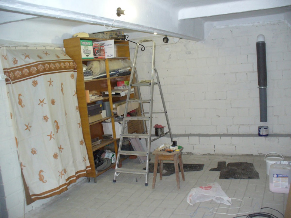 Пока занимался благоустройством основного помещения, периодически заныривал в подвал-осмотреть и обдумать план действий. Раньше, во всех моих гаражах влаги в подвале не наблюдал. С подобным столкнулся в первые. Предыдущие гаражи все строил сам и вентиляцию закладывал по стандарту-две трубы на помещение, приток до пола, отток из под потолка. Все всегда работало. Было в помещениях сухо и присутствовал свежий воздух. В этом гараже решил идти по накатанной. Определюсь с помещениями, сделаю вентиляцию и все будет хорошо.