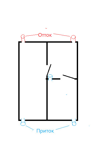 Принцип такой. В каждом помещении -две трубы. Одна до пола-приток и другая от потолка-отток. Только так.