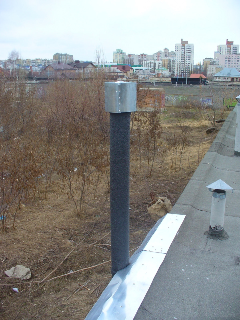 Занимался своими делами и работой сверху. Нарастил трубы вытяжки. Поставил дефлекторы.