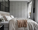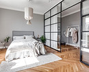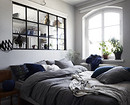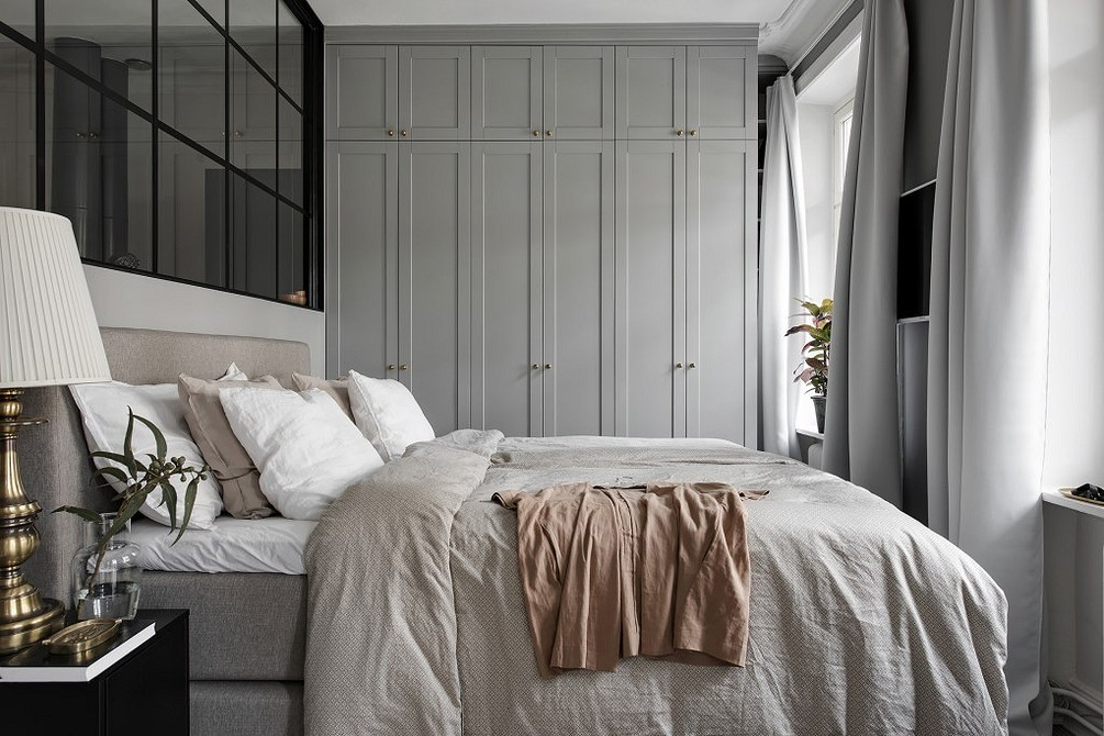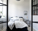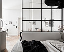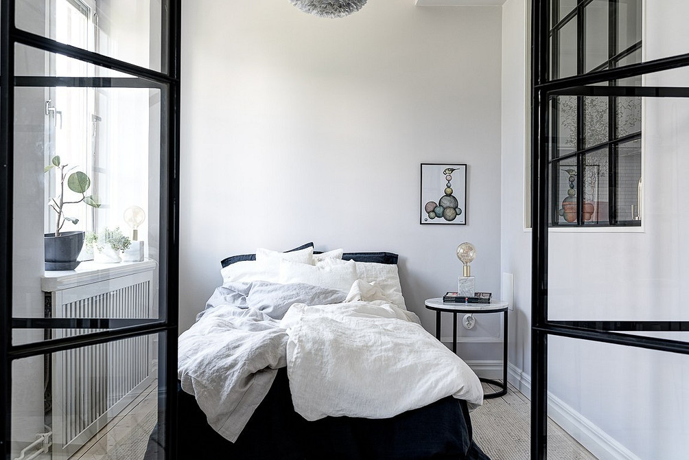 В интерьере этой спальни стеклянная перегородка с высокой распашной дверью заменила собой целую стену: это позволило максимально наполнить светом крайне небольшое пространство, сделав его визуально более просторным и воздушным.