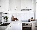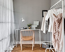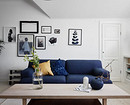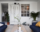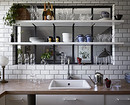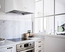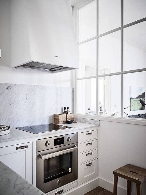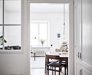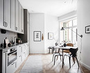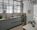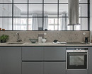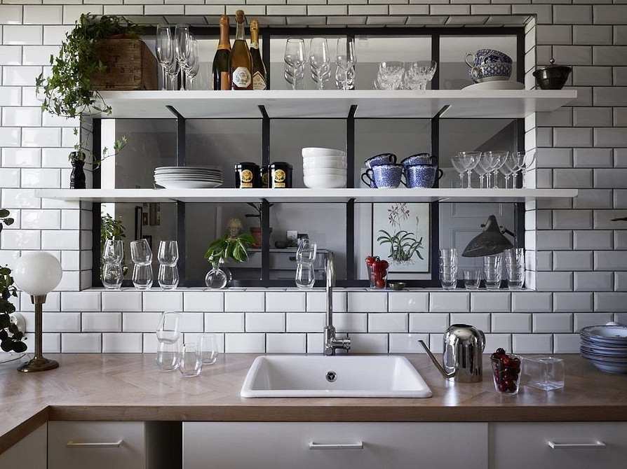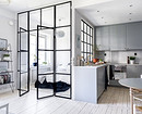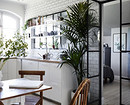 В этой квартире стеклянные перегородки выступили в качестве окон: одно из них обеспечивает проникновение света из гостиной в прихожую, другое — из кухни в спальню. Интересно, что у окошка над рабочей поверхностью кухни есть и еще одно функциональное назначение: дизайнеры дополнили его полками и организовали на них открытое хранение посуды.