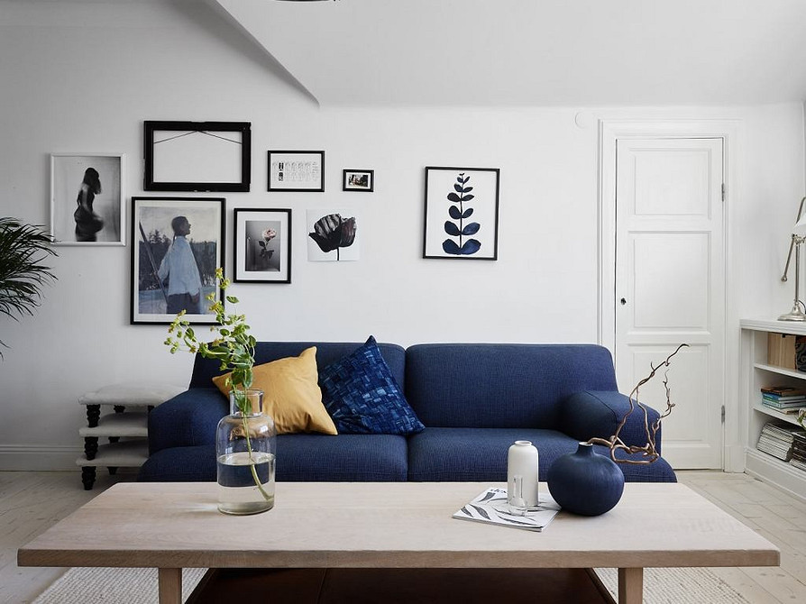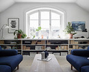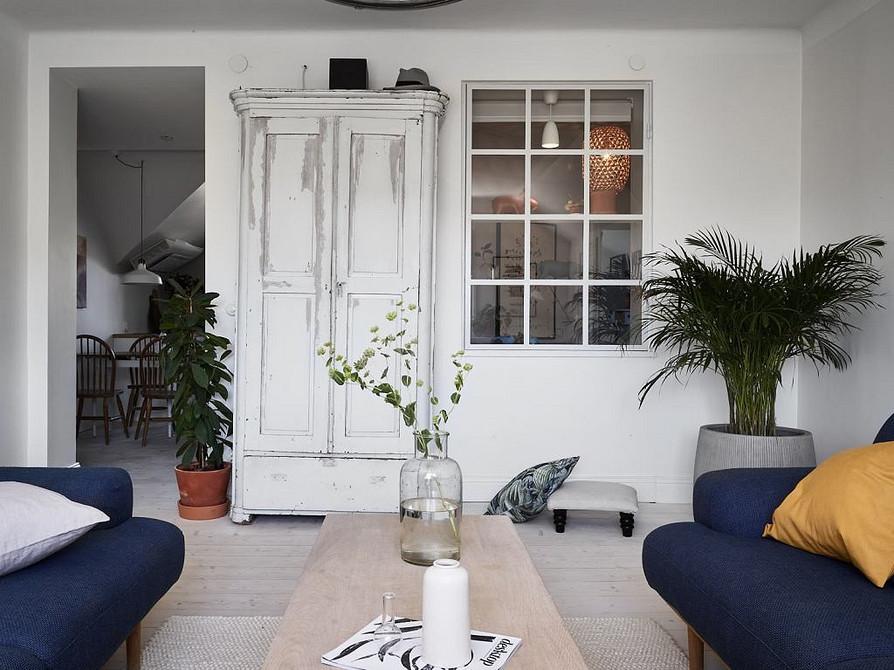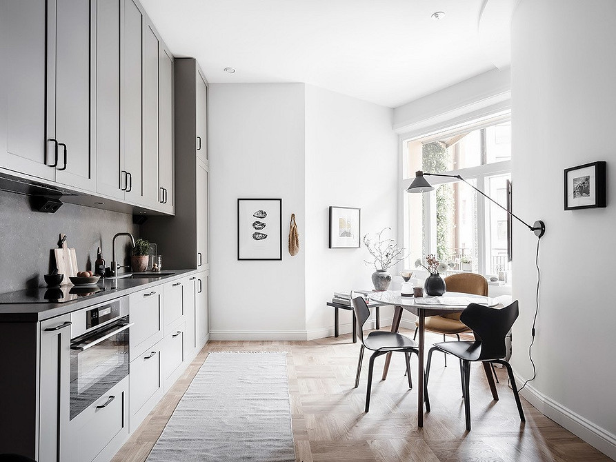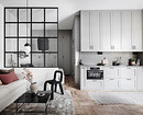 Благодаря этому из гостиной в мини-кухню свободно проникает естественный свет — и при этом зона готовки в достаточной степени обособлена и отделена от жилого пространства.