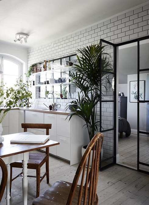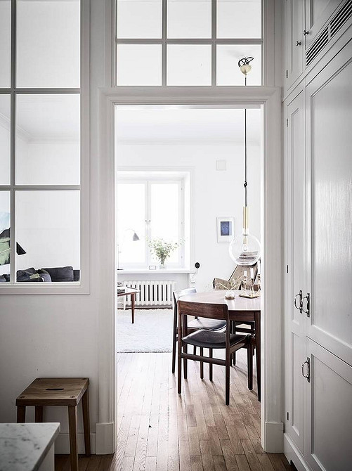 Вы только посмотрите: одна из стен этой мини-комнаты имеет окно на улицу, другая представляет собой стеклянную перегородку с распашными дверьми, а в третьей обустроено большое окно в кухню, благодаря чему зона готовки получает достаточно естественного света. Смелое решение, весьма эффективно решающее вопрос с максимизацией солнечного света в квартире.