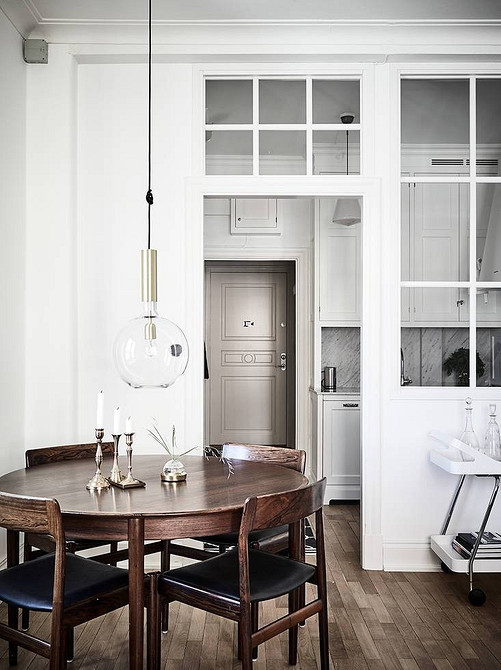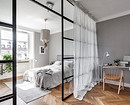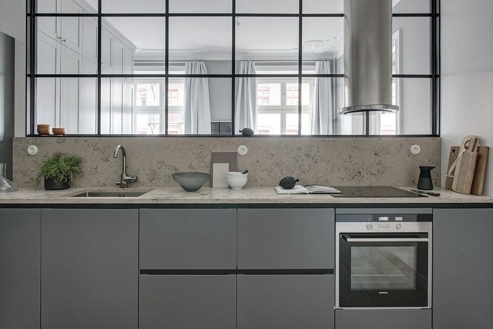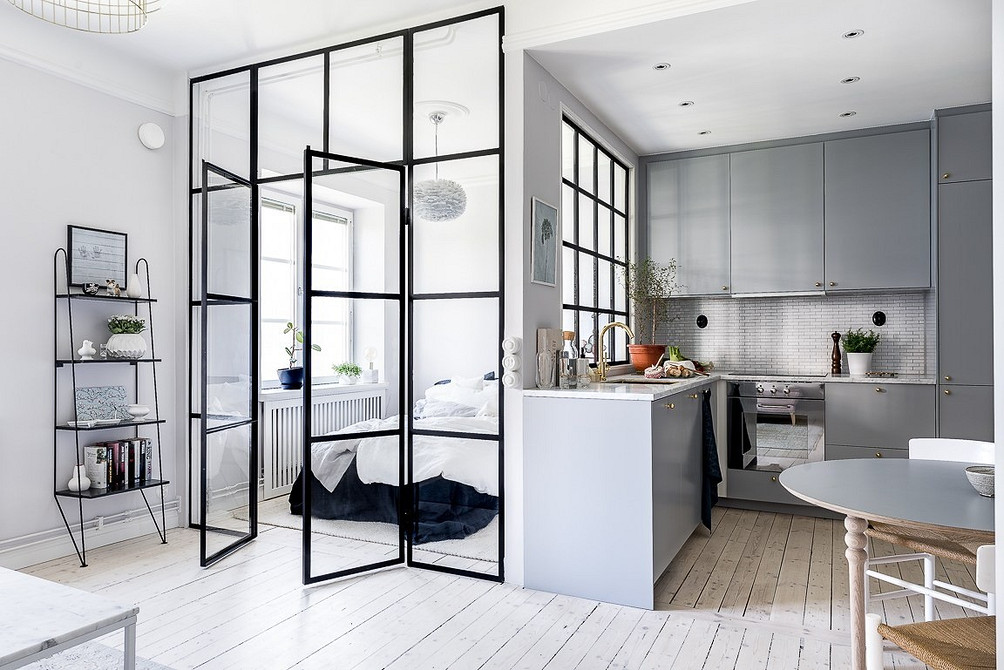 Владельцы этой квартиры использовали стеклянную перегородку для того, чтобы превратить одну комнату в две. В результате получили полноценную спальню и уютную кухню-столовую. Просто и эффектно, не правда ли?