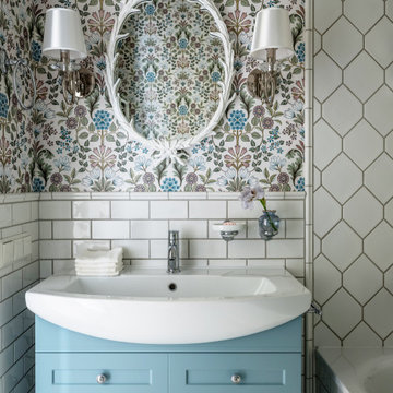 Ванная в стиле Прованс с цветочным орнаментом в обоях, с классической плиткой.