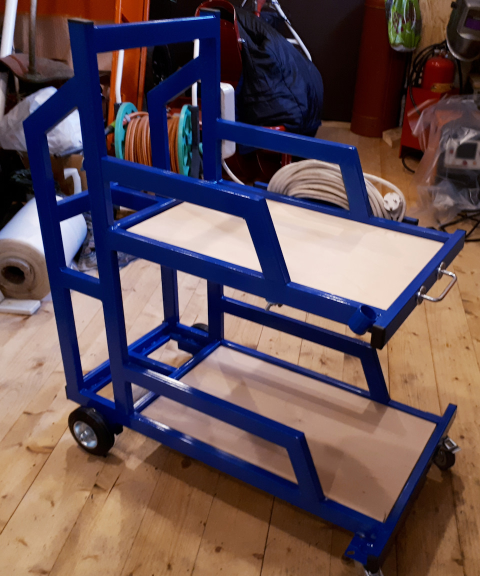 Для изготовления тележек используют металлический профиль круглого или прямоугольного сечения. Для площадки используются стальные листы, просечная металлическая сетка или поперечный набор из уголков. Заготовки свариваются вместе, затем зачищаются и красятся порошковыми красками, защищающими элементы конструкции от коррозии.
