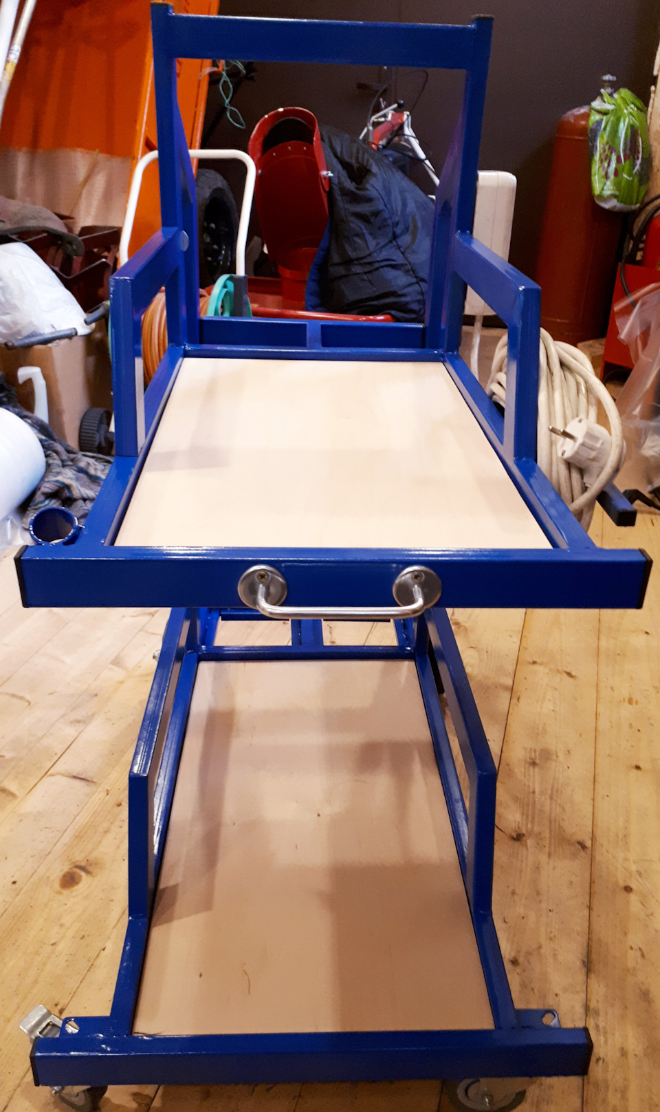 Тележка для удобного перемещения споттера по цеху. Передние поворотные колёса имеют стопора для надёжной фиксации тележки. Две полки для свободного хранения аксессуаров для споттера