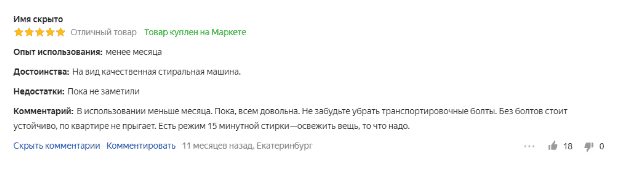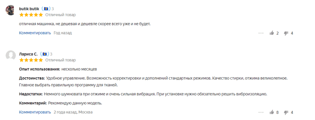 Мы не стали вносить большой набор воды (52 литра в среднем) в минусы, потому что некоторые покупатели считают его, наоборот, преимуществом. В этом случае белье совсем не мнется даже на максимальной скорости отжима, а здесь она аж 1200 оборотов в минуту! Просто стоит взвесить, что важнее: чуть больше заплатить за электричество или тратить чуть больше времени на глажку.