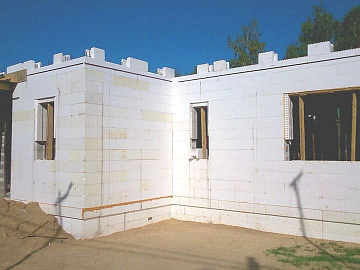 - После обустройства фундамента можно начинать строительство стен. Процесс включает установку блоков, армирование, цементирование. Крепление первого ряда осуществляется к фундаменту при помощи вертикальной арматуры. Далее происходит укладка прутков в пазы блоков. Цементирование осуществляется через каждые 2 ряда блоков. Из-за высокого коэффициента теплового сопротивления, возможно получение достаточно тонких стен, поэтому дополнительно утеплять их не нужно.