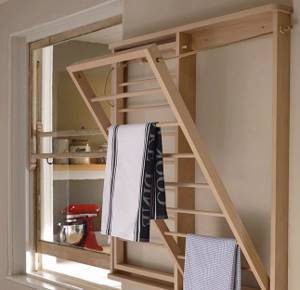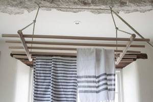 Отлично себя зарекомендовали деревянные складные “гармошки”, подвесные потолочные сушилки или откидные приспособления, вмонтированные в стену.
