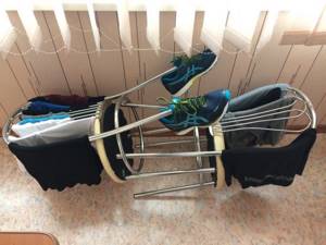 В разложенном виде сушилка занимает довольно много места (особенно конструкции с дополнительными модулями), но зато позволяет удобно разместить большое количество вещей. В собранном состоянии толщина сушилки не превышает 10 см, и ее легко можно задвинуть между ванной и стиральной машиной. Плюсы: простота использования и долговечность; небольшой вес; отличная вместимость; сушилку можно ставить в любое удобное место; нет необходимости монтировать крепления. Минус у таких сушилок только один — они занимают полезную площадь, а для малогабаритной квартиры это очень актуальная проблема.