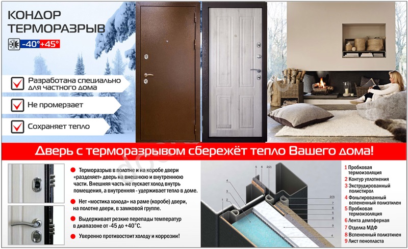 я вам как дилетант объясню.Дверь с терморазрывом -это дверь в которой знаружная замерзающая часть и внутренняя теплая разделены увставкой-обычно пластик -это позволяет разорвать мостик предачи холода внутрь.Поэтому водяные пары не оседают на внутренней поверхнсти.