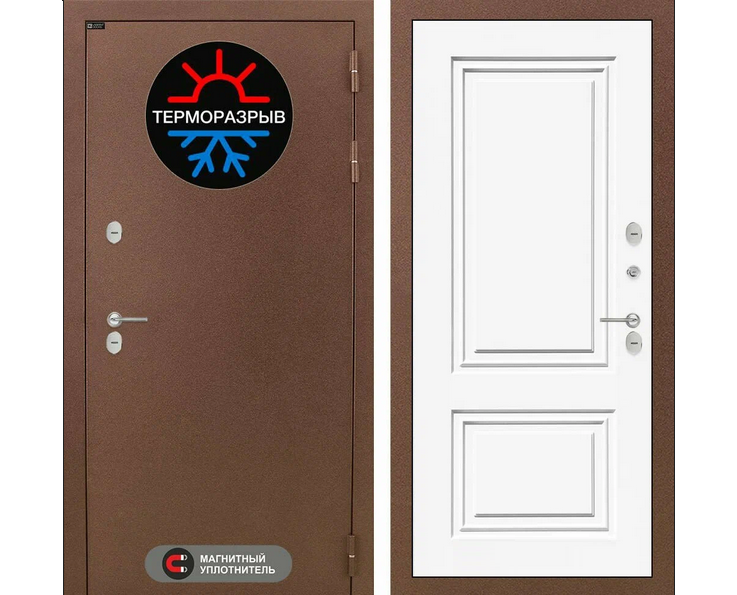 - Красивая обивка: внешний лист покрыт краской цвета Антик медь. Внутридомовая сторона — МДФ панелью с 3 красками на выбор.