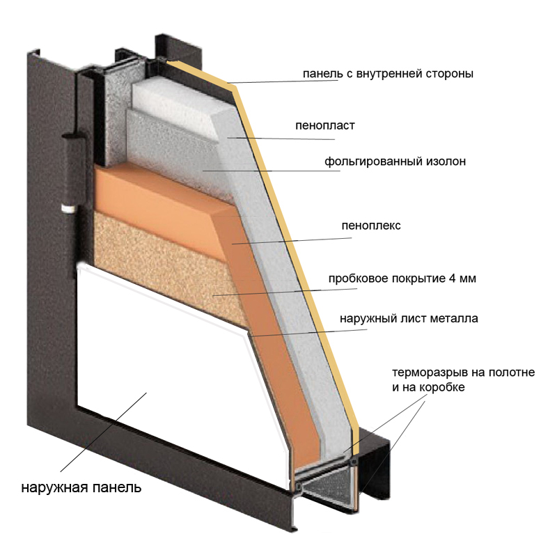 - Термоизоляционные слои двери — экструдированный пенополистирол, изолон, фольга, пенополистирол.