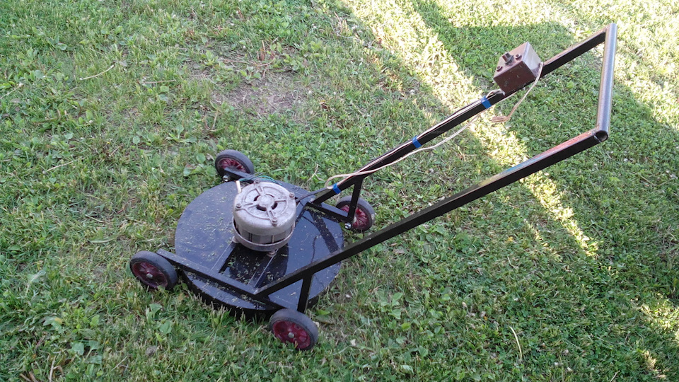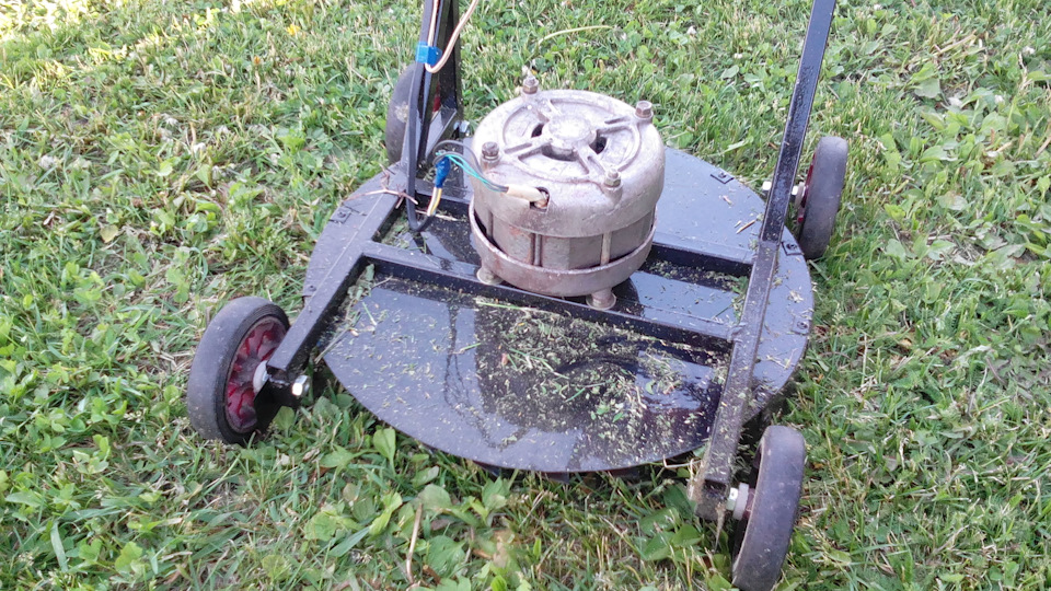 Мотор от стиралки, на шкив нагрев фитинг полипропиленовый надел и просверлил насквозь отверстие хотел болт насадить, но и так крепко вышло, там паз есть на шкиве и пластмасса и туда зашла застопорив. Нож из простой железки шириной 3-4 см и в диаметре 35 см. Нож от пола на высоте 4,5 см. Мотора хватает на нормальную траву, на очень густой траве он останавливается. Но после того как первый раз прошел, второй раз уже ни разу нигде не тормозил. Мотор греется, после прохода 70 м2 даем мотору остыть, дабы не сгорел. Косил 1 раз в неделю. При покосе траву разбивает всю и получается как мульчирование, даже убирать не надо. А да по поводу камней на участке нет, поэтому все нормально.