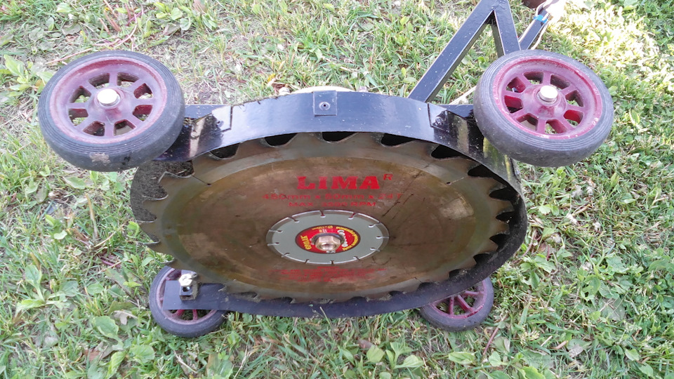 И вот настало время это все облагородить и сделать нормальную косилку, так как на деревянной разболтались все деревянные колеса. Собрав все детали на металлоприемке- мотор от стиралки, кнопку пусковую, колеса от коляски, пила дисковая 470*50 мм, крышку от железной бочки и полоску железа и из имеющихся профиля 20*20 мм и куска трубы диам. 16 мм соорудил следующее чудо.