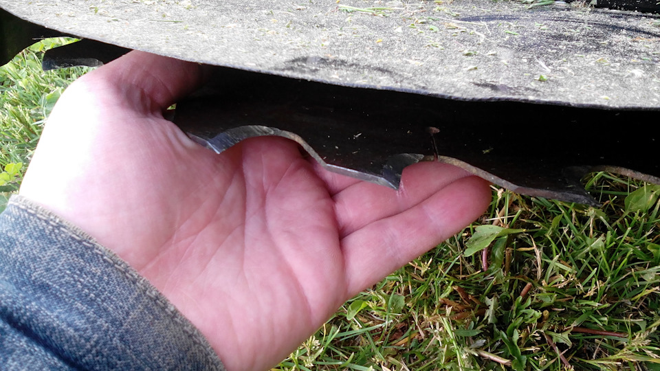 Поработав газонокосилкой не понимал почему то не так красиво получается как старой своей косилкой. В итоге подумал попробовать сделать нож наподобие как на старой. Сделал из полотна ножовки по дереву. После покоса результат меня обрадовал, но не понятно почему пильный диск не дает такого результата, не понятно. В итоге сейчас пользуюсь ножом как на картинке и результат отличен, раскручивается за доли секунды, но на большой траве все таки останавливается, так как нет инерции как на диске.