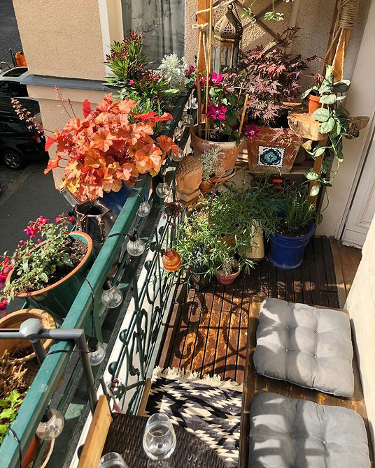 - Соответствие виду . Из окна видно только шумную и пыльную улицу? Оградите себя от городской суеты кадками с растениями, создав балкон в стиле jungle. Если за окном итак лес или роща, от домашних цветов можно отказаться в пользу более индустриального декора.