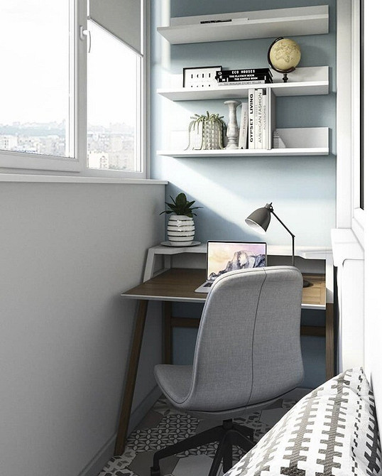Третий важный элемент интерьера — стол. Поставить чашку с ароматным напитком, положить книгу, телефон или рабочий ноутбук — он точно пригодится. В квадратной лоджии можно сделать широкий подоконник, который одновременно заменит стол и полку для чего-то необходимого (например, комнатных цветов).