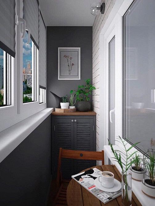 Ещё один цветовой приём — комбинация светлых и темных тонов . Она используется при обустройстве маленького балкона вытянутой формы. Короткие стороны окрашиваются в темный (любой, вплоть до матового черного), а длинные в светлый.